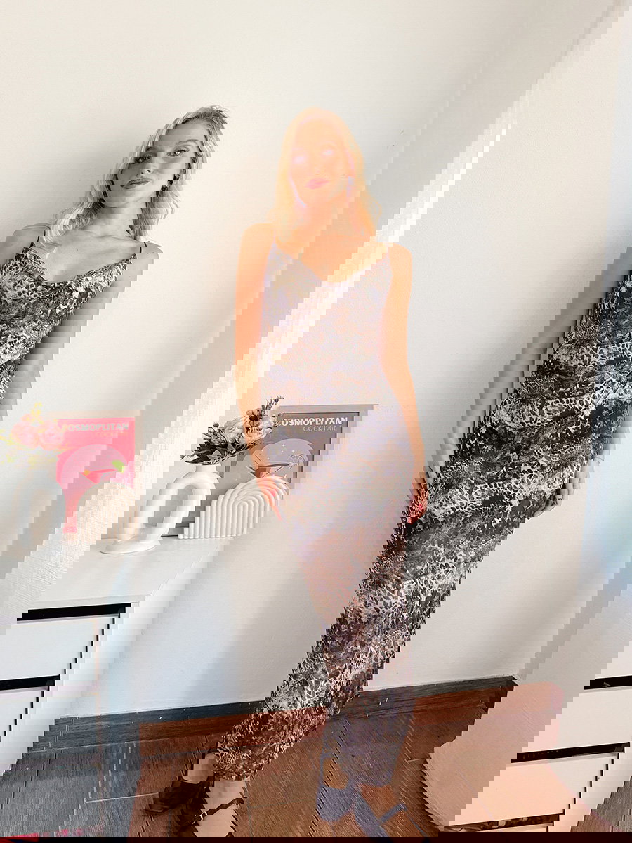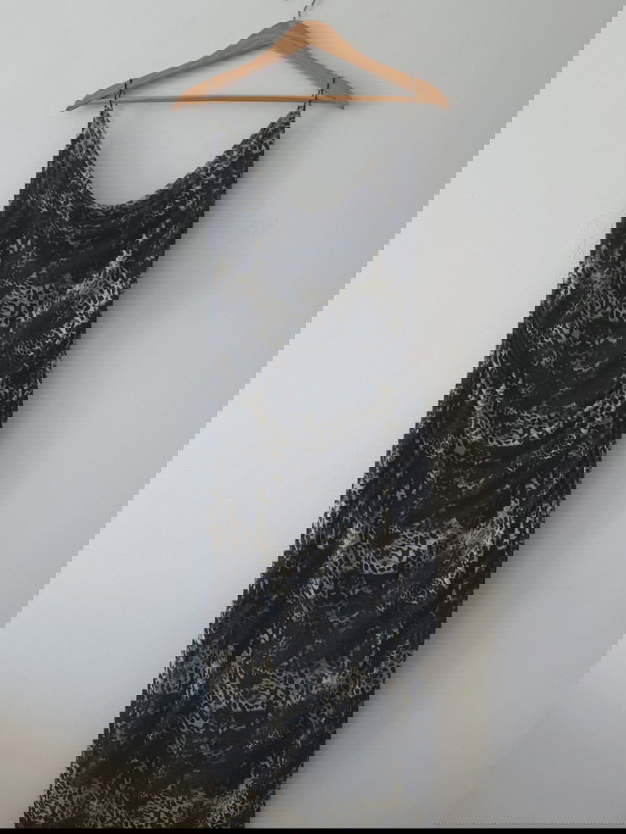 Vestido largo estampado, con escote drapeado y breteles finos. Presenta silueta al cuerpo, frunces laterales y terminación recta en el ruedo.