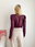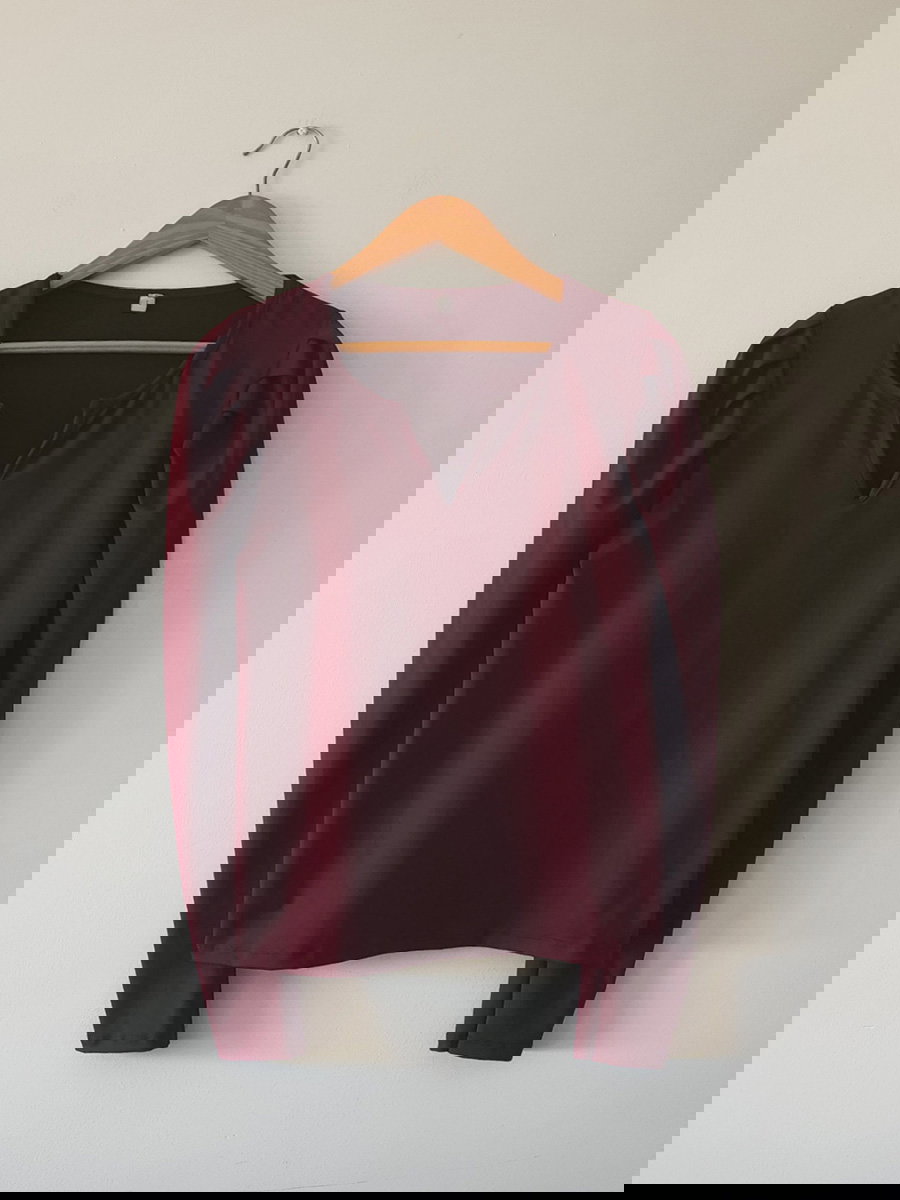 Blusa de tela lisa, con escote redondeado y abertura central en el delantero. Presenta mangas largas con volumen en hombros, calce recto y terminación simple en puños y ruedo.