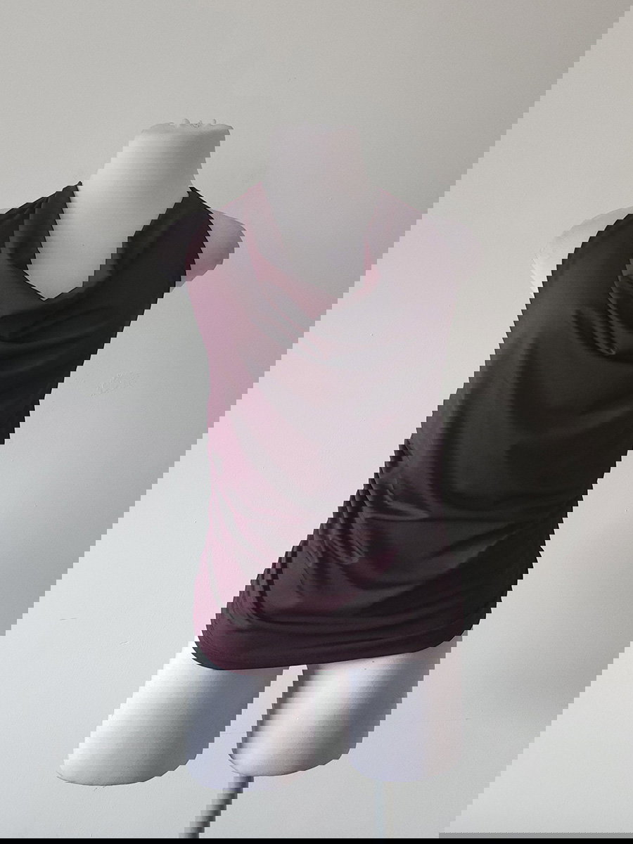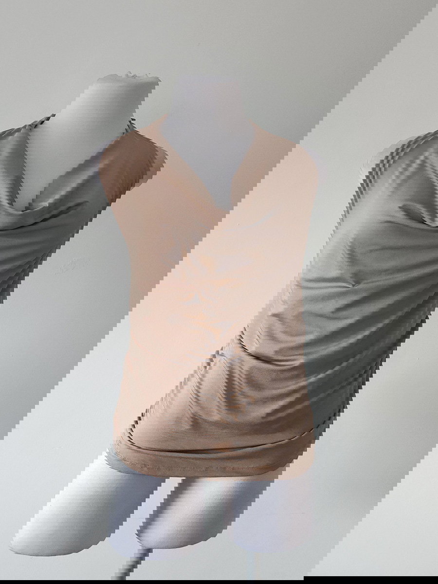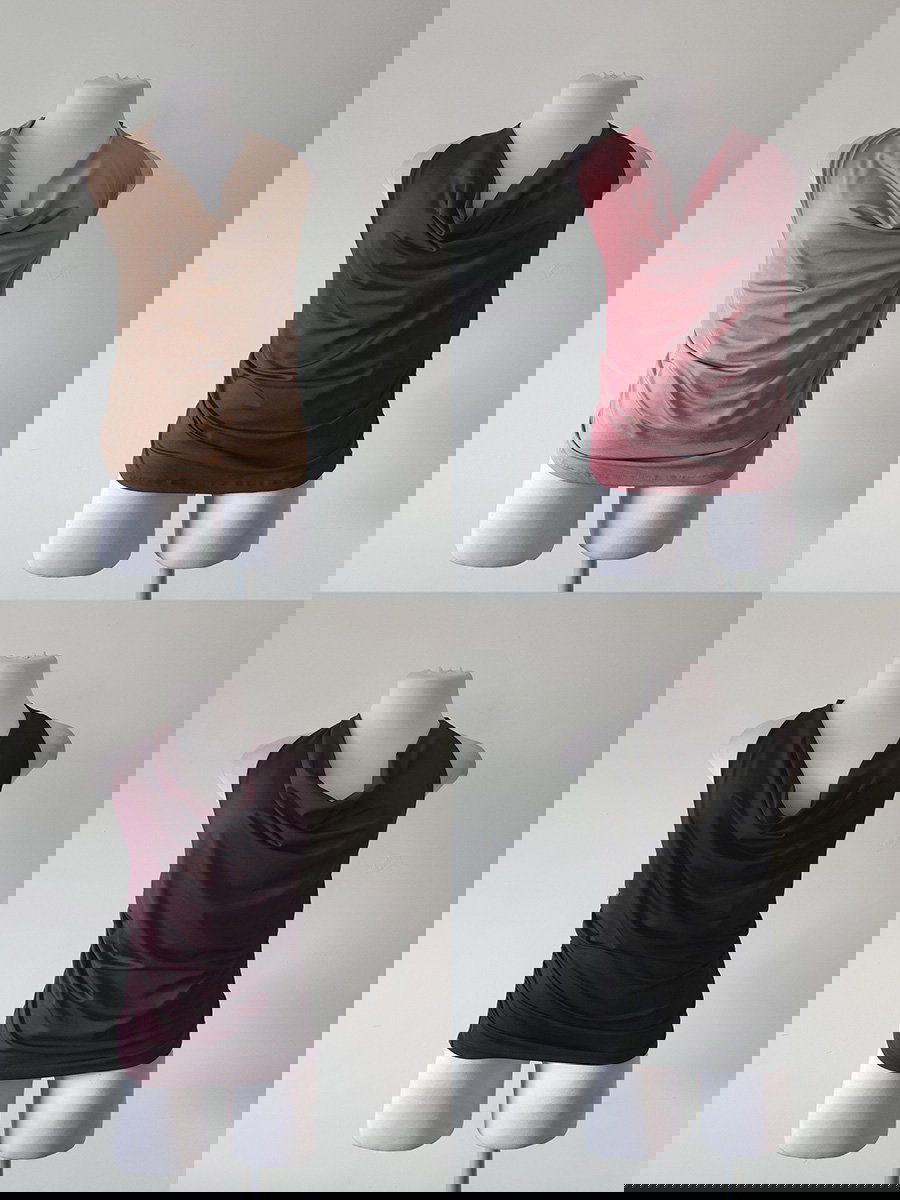 Blusa sin mangas de tela satinada, con escote drapeado y calce al cuerpo. Presenta frunces laterales y terminación recta en el ruedo.