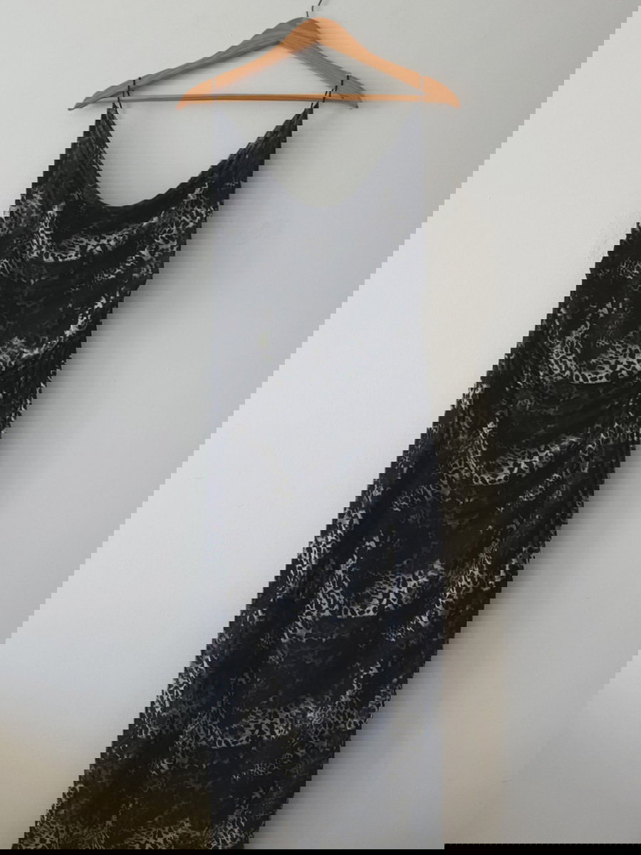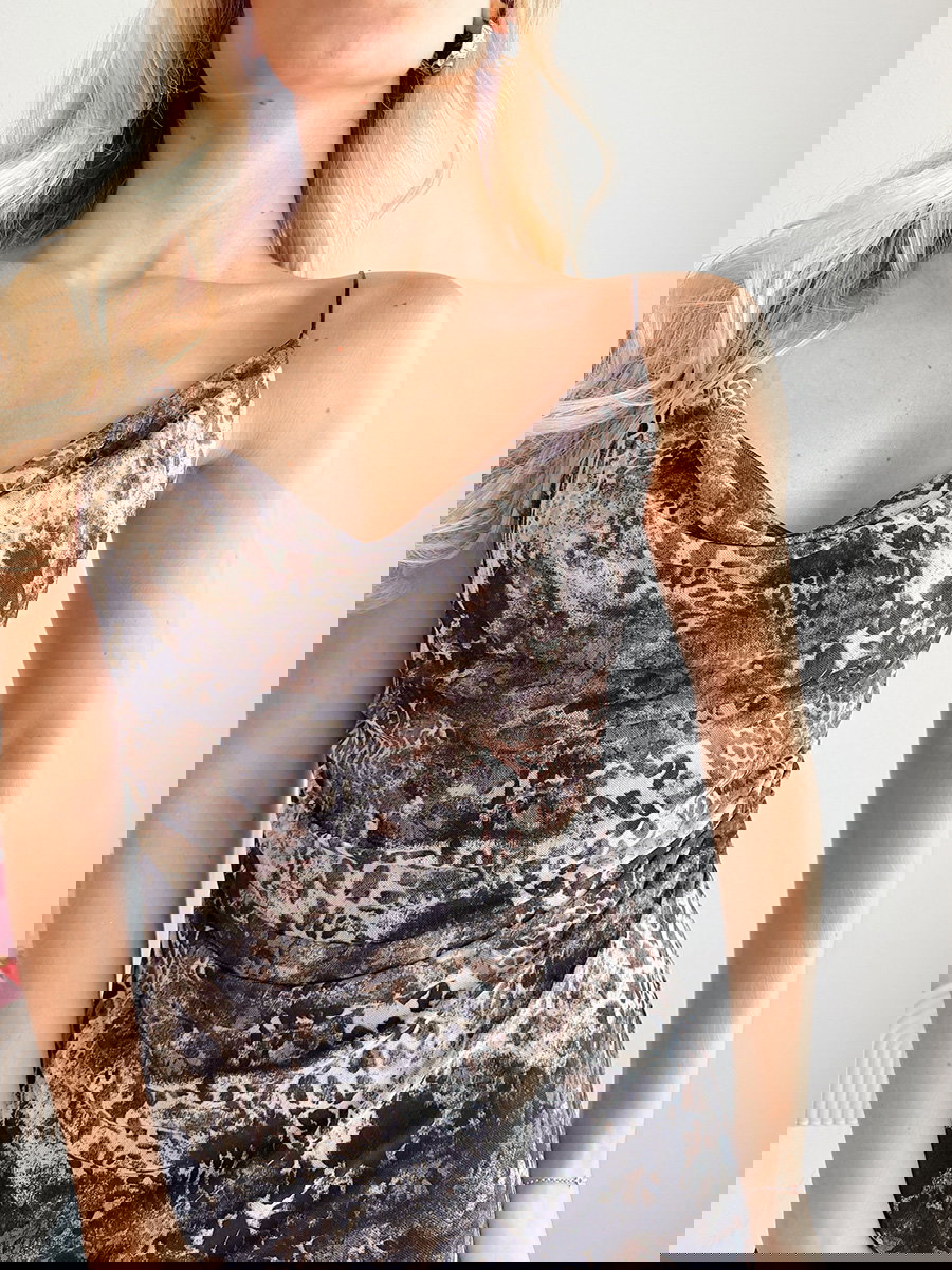 Vestido largo estampado, con escote drapeado y breteles finos. Presenta silueta al cuerpo, frunces laterales y terminación recta en el ruedo.