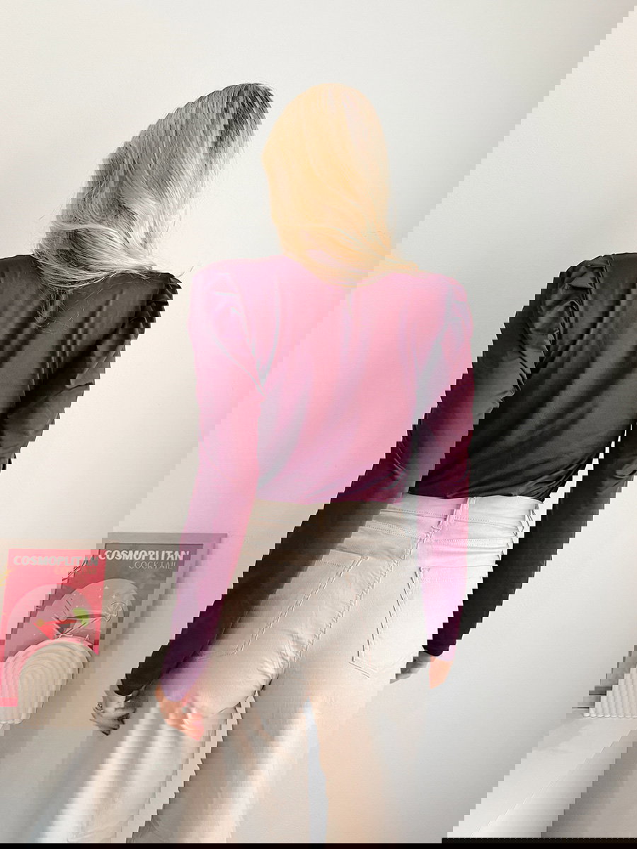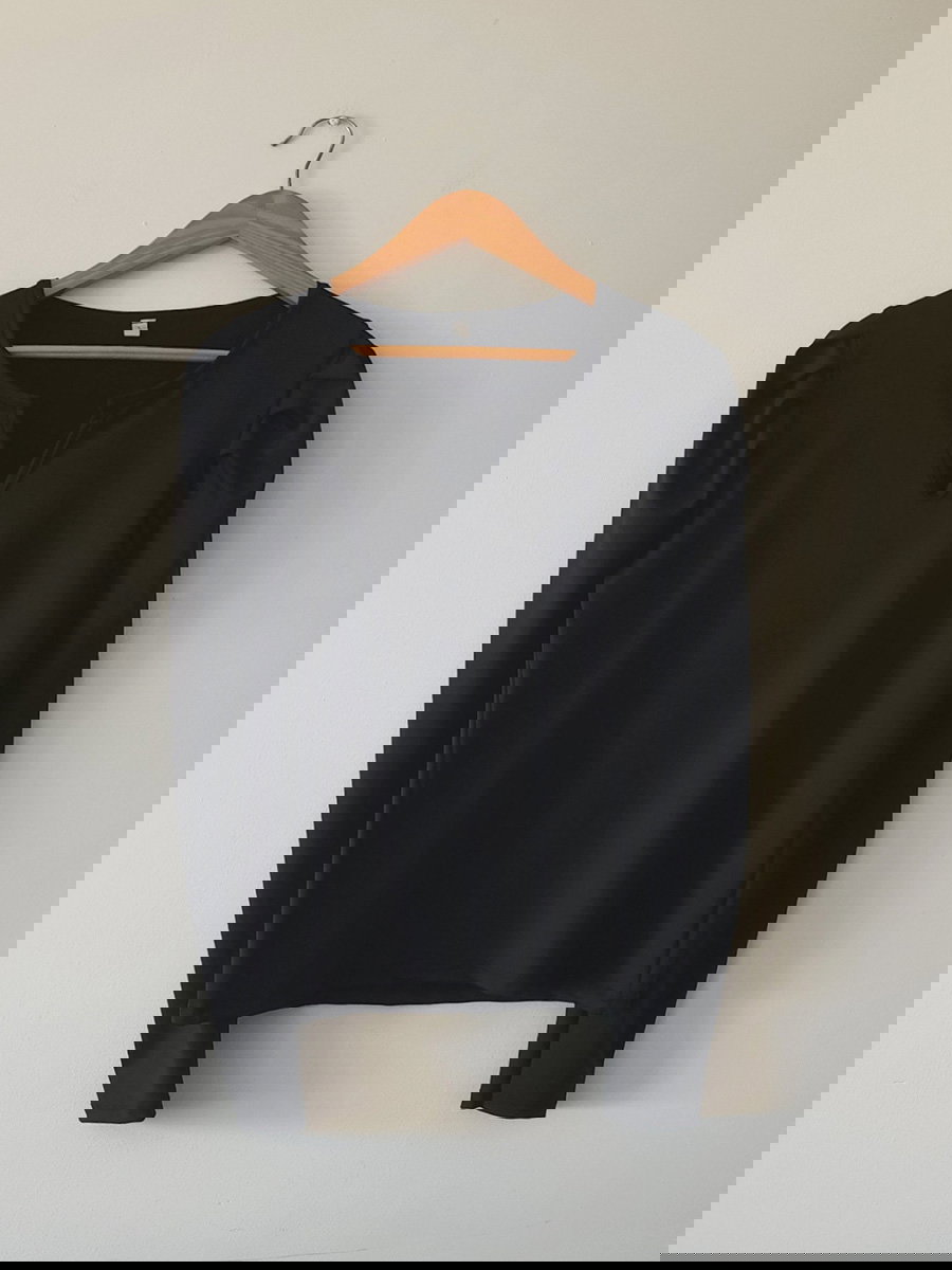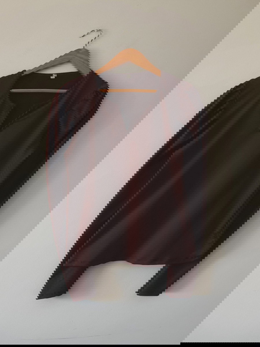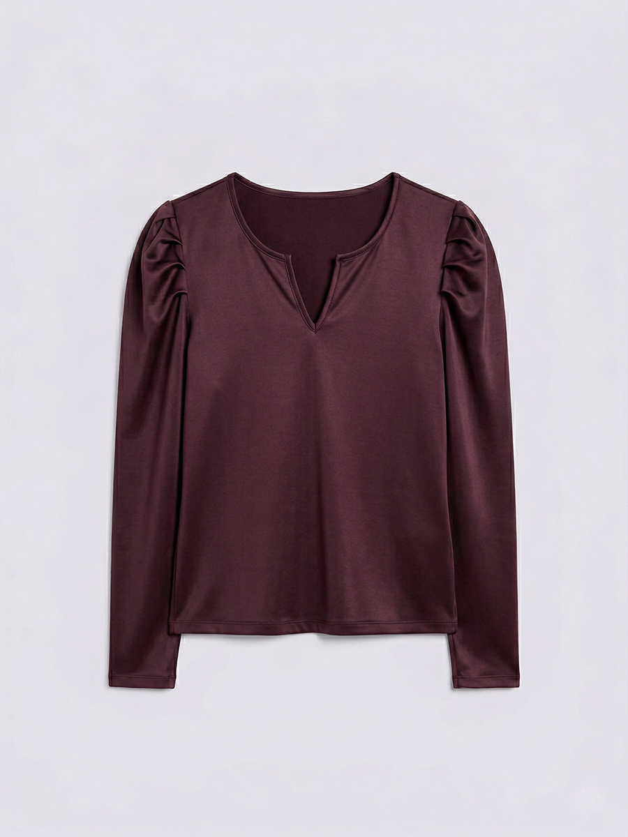 Blusa de tela lisa, con escote redondeado y abertura central en el delantero. Presenta mangas largas con volumen en hombros, calce recto y terminación simple en puños y ruedo.