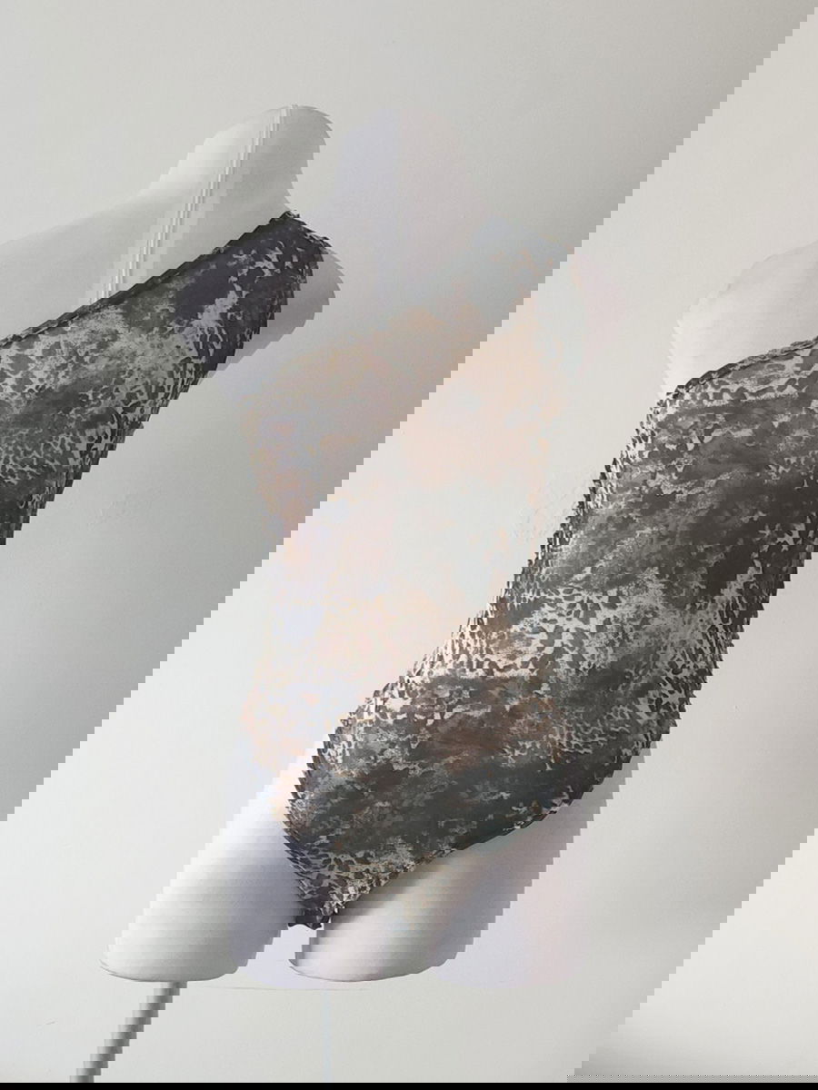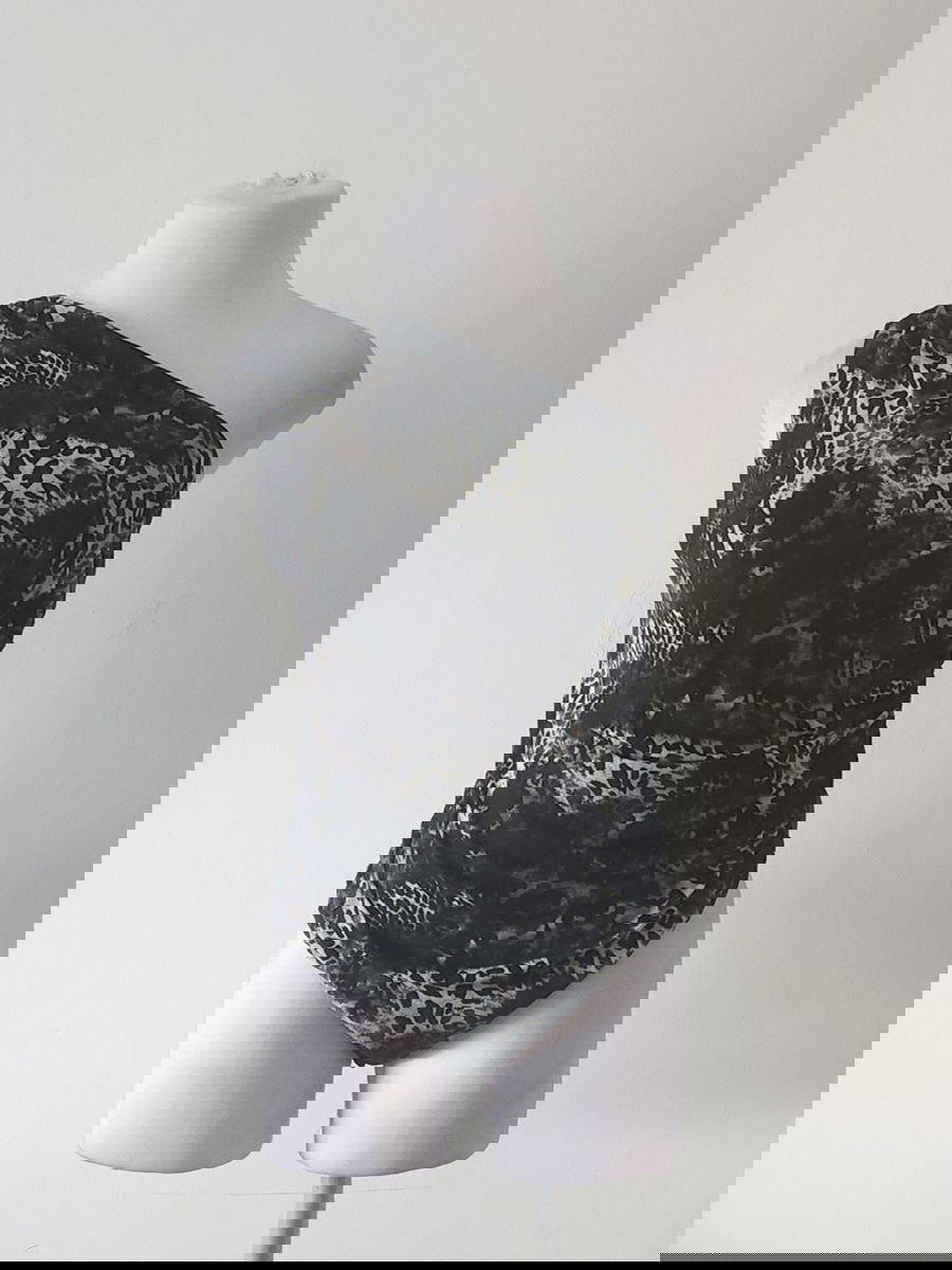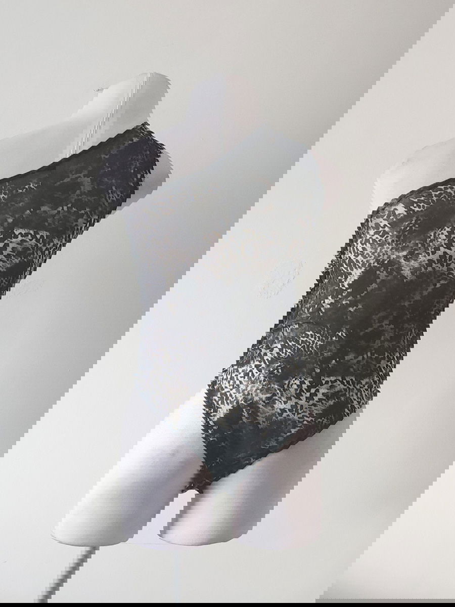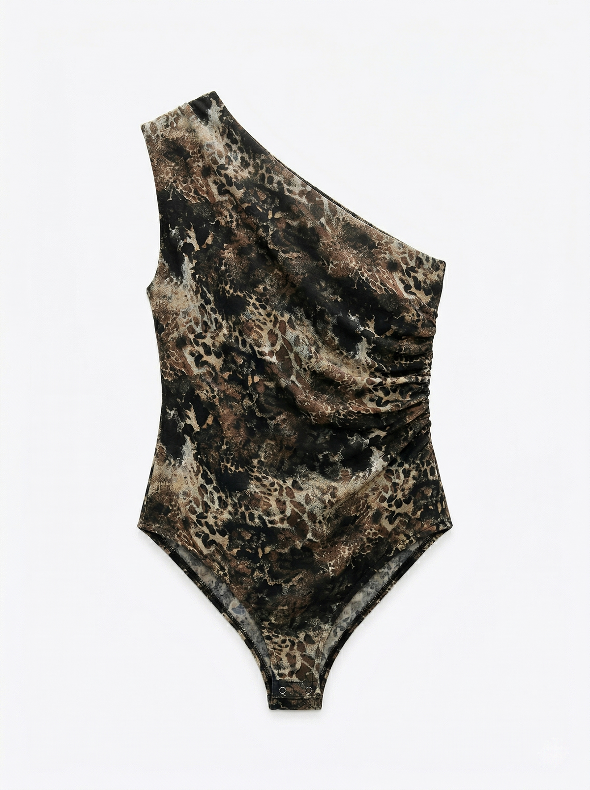 Body de un hombro con diseño asimétrico y estampado integral. Presenta frunces laterales, calce al cuerpo y base cavada con broches en la parte inferior. Disponible en talles S y L