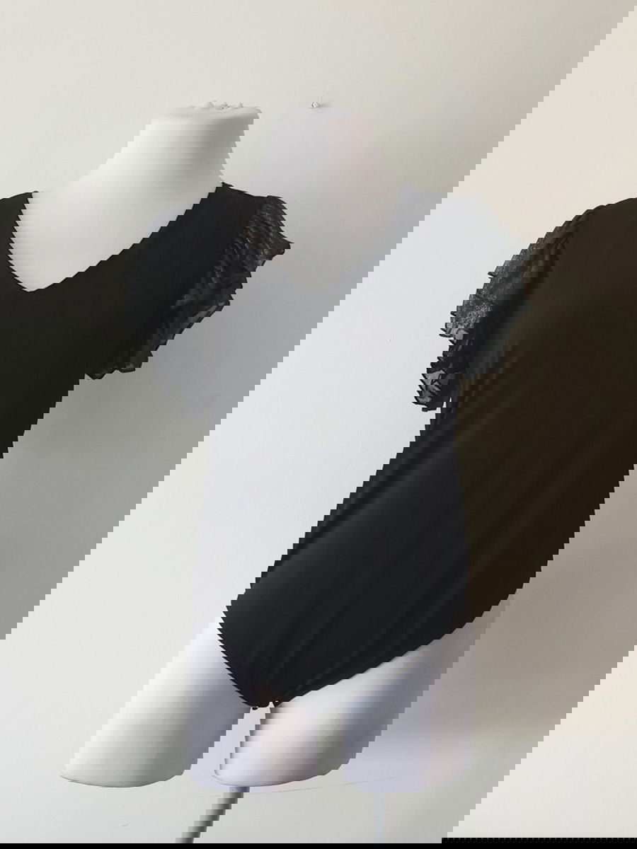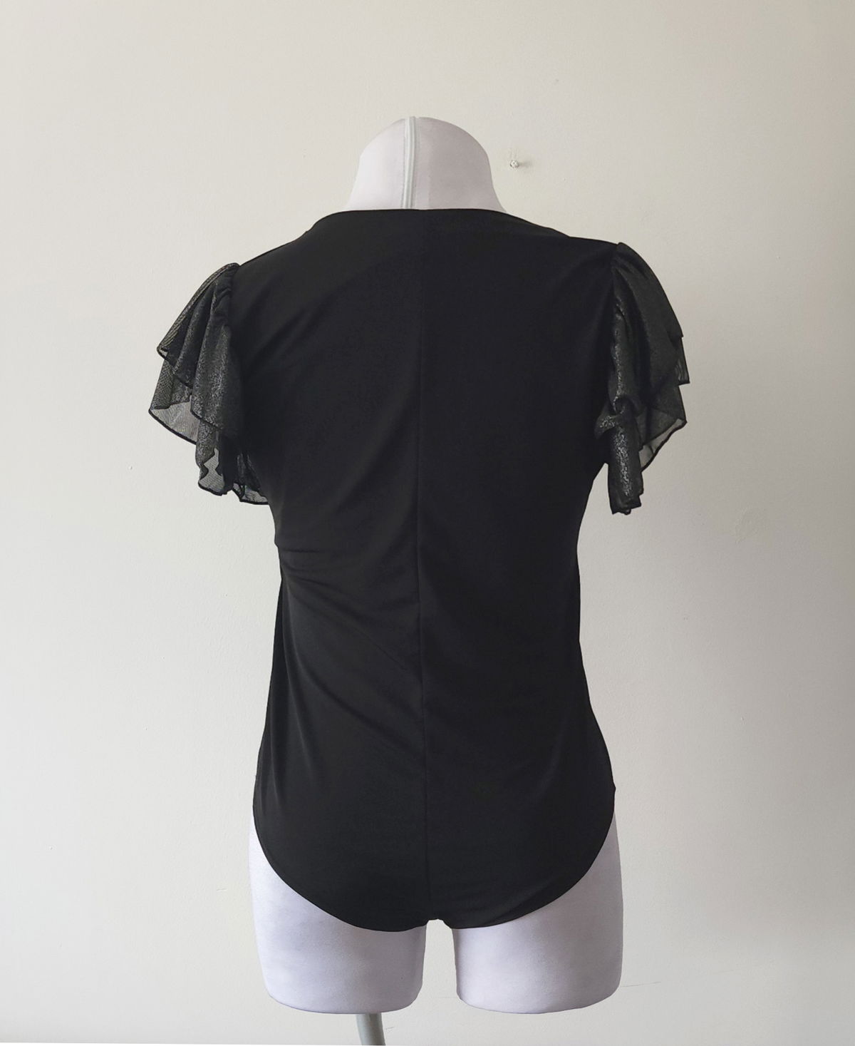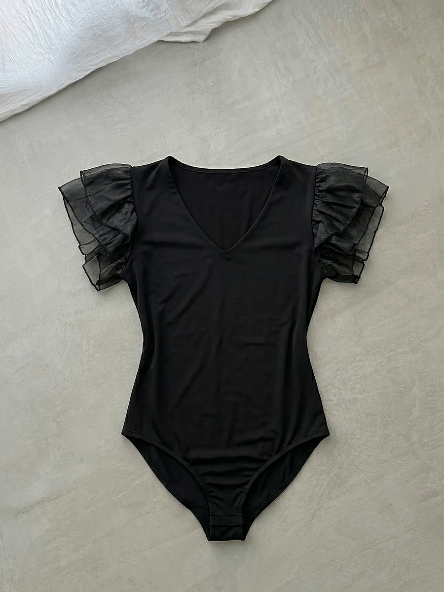 Body de calce al cuerpo con escote en V y mangas cortas con volados en gasa. Presenta frente liso, espalda cerrada y base cavada con terminaciones limpias.