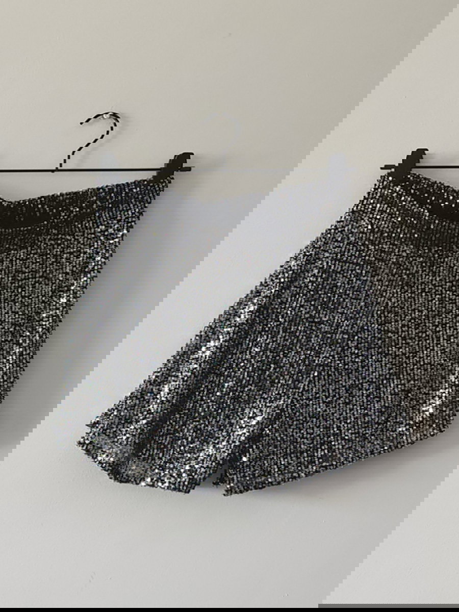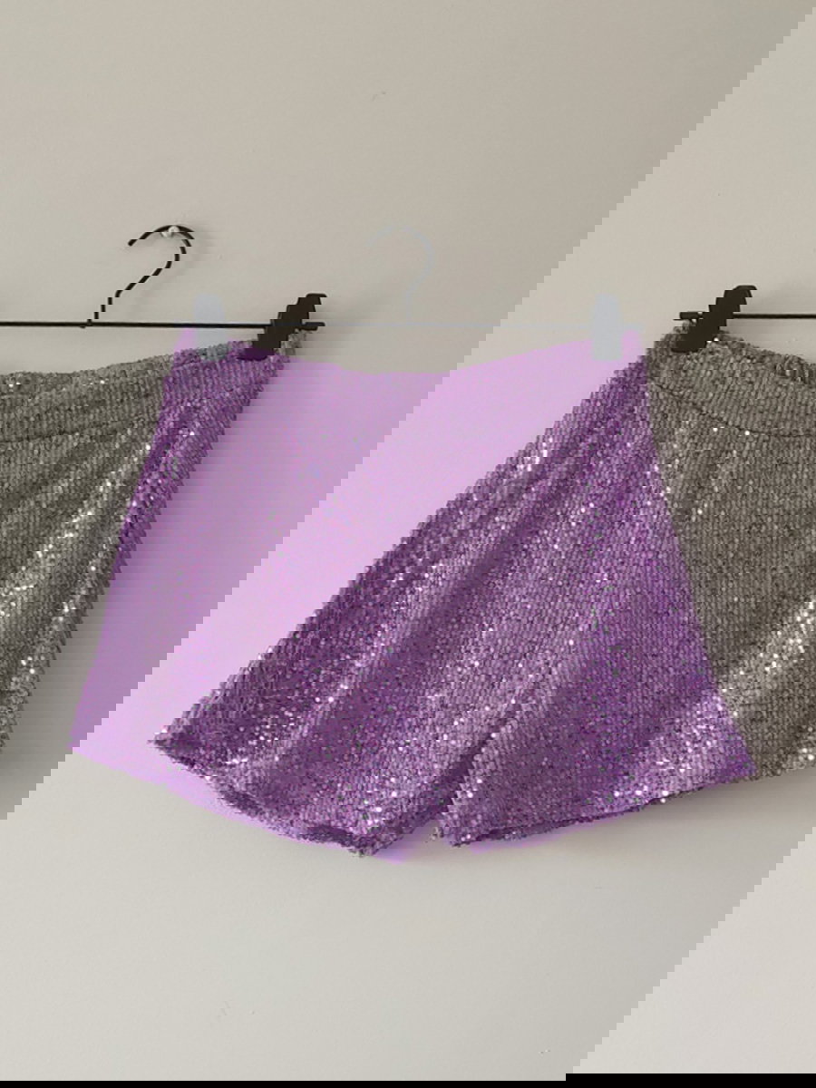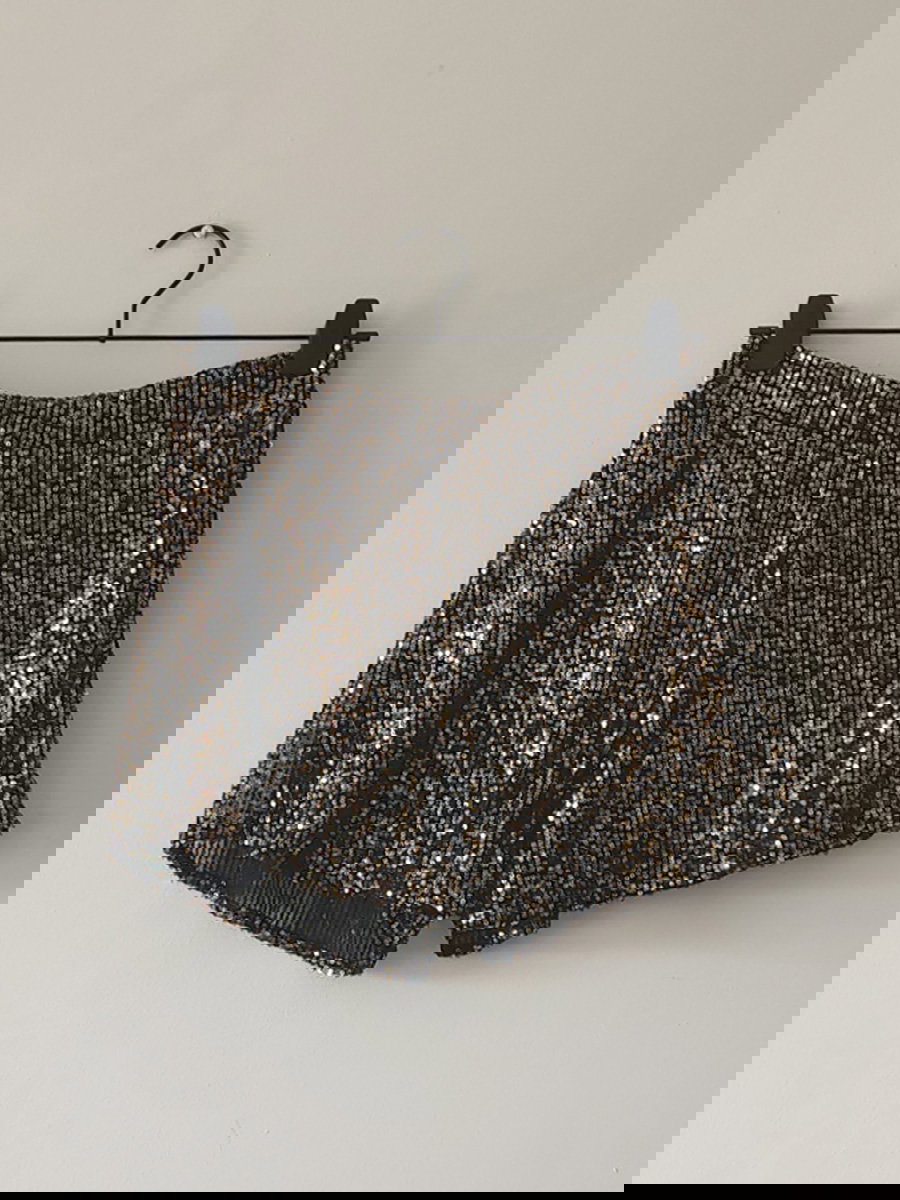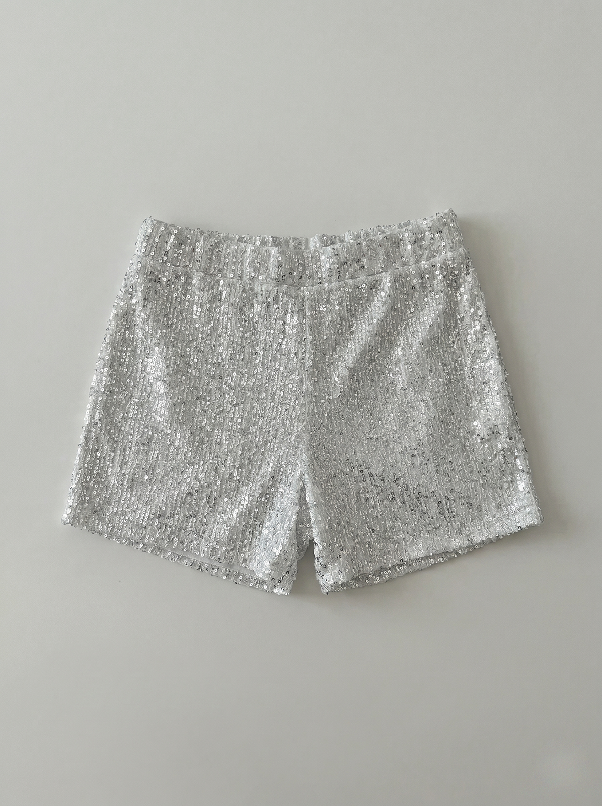 Short íntegramente cubierto en paillettes, con tiro medio y cintura elástica. Presenta silueta recta, pernera amplia y terminación simple en el ruedo.