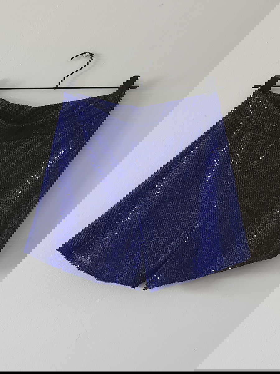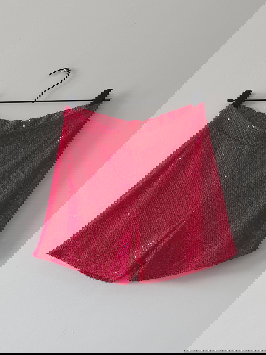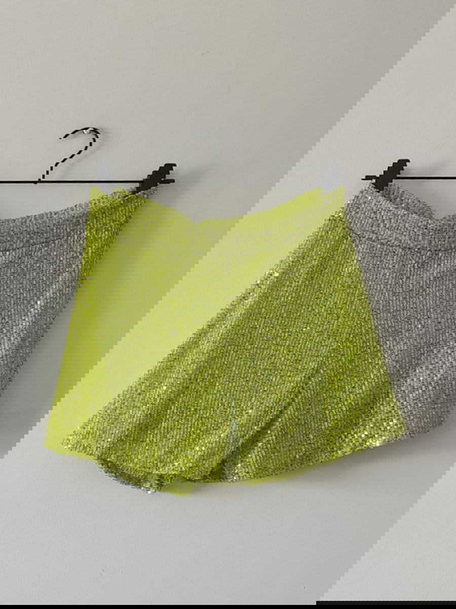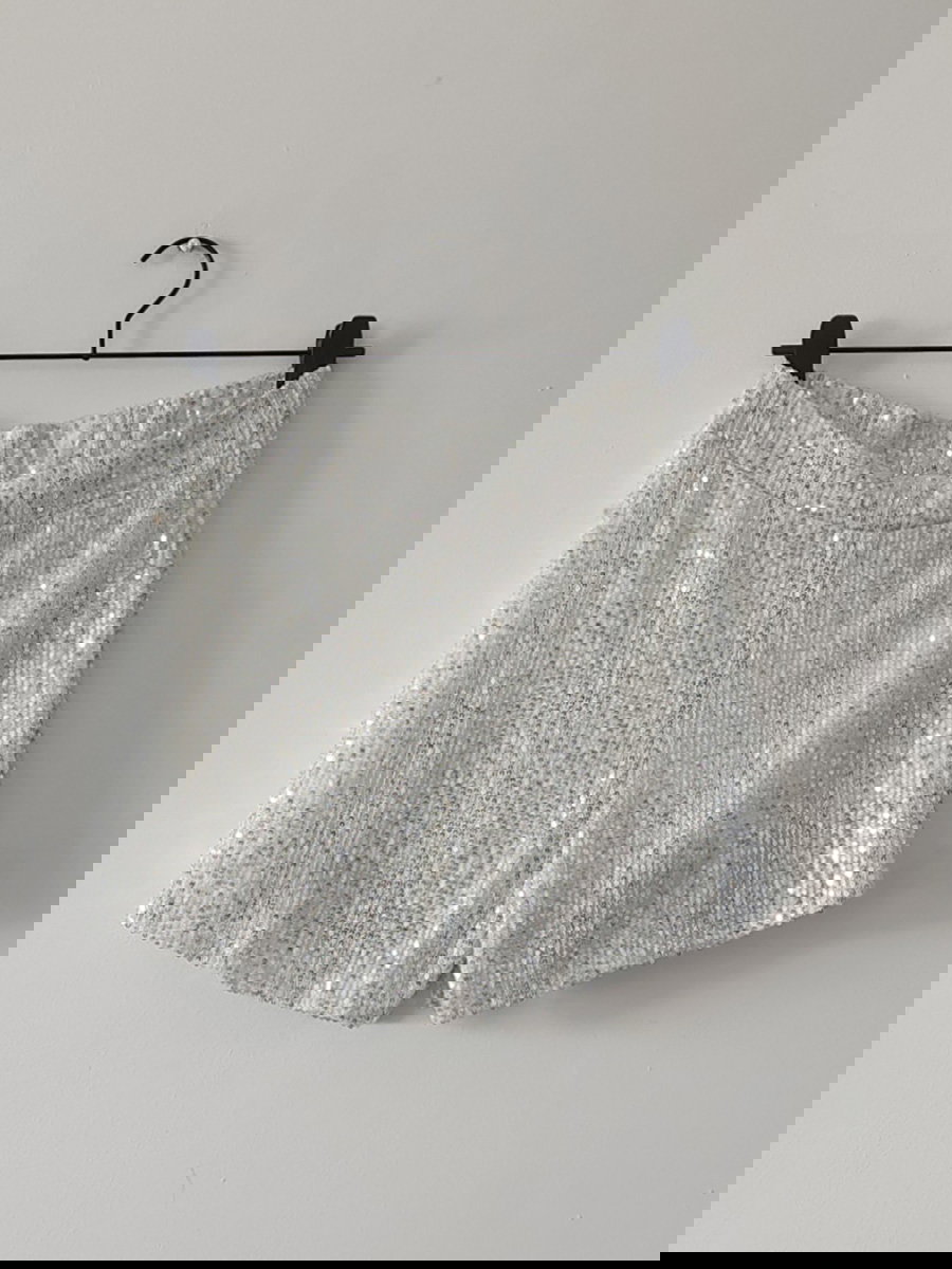 Short íntegramente cubierto en paillettes, con tiro medio y cintura elástica. Presenta silueta recta, pernera amplia y terminación simple en el ruedo.