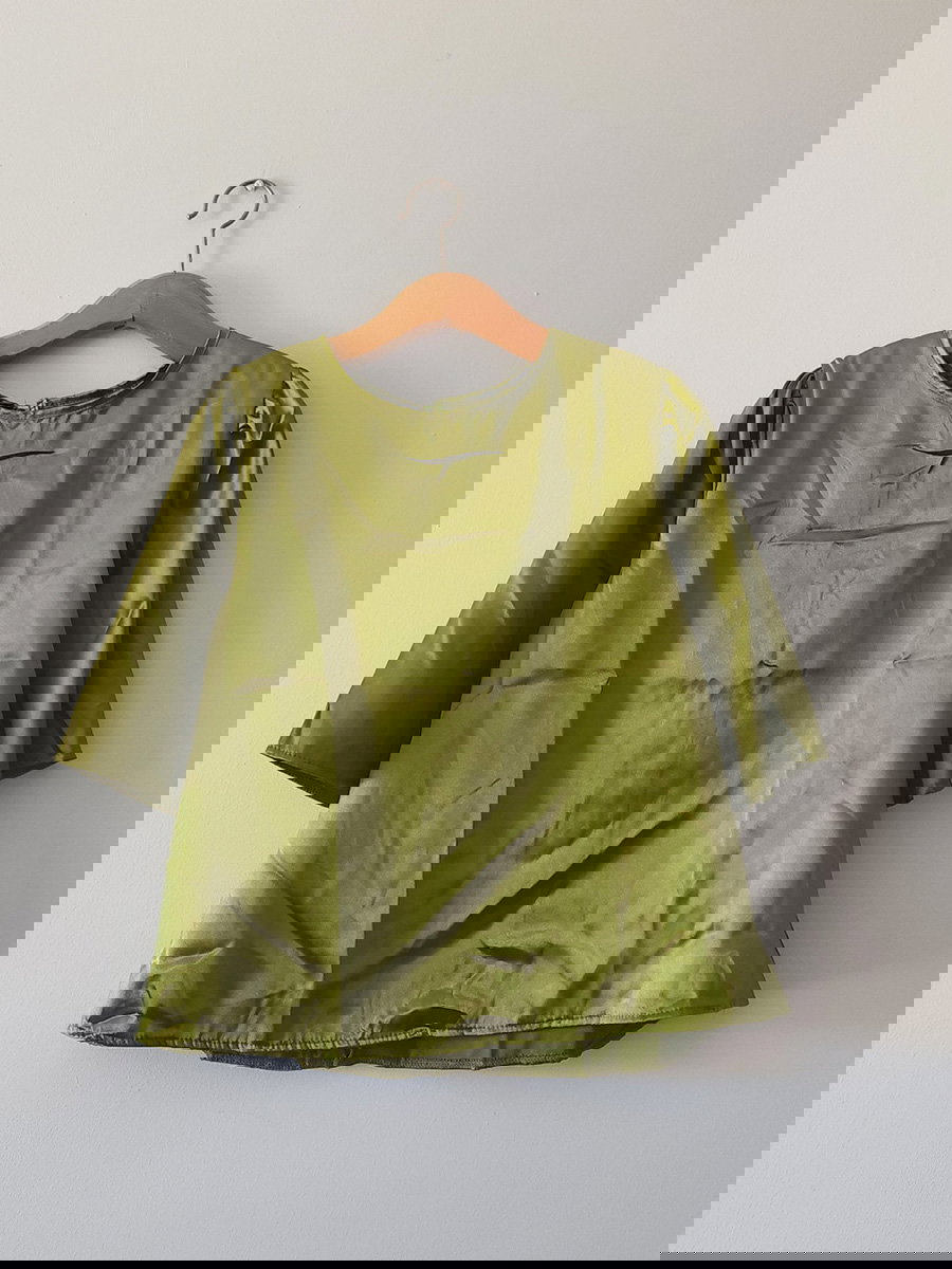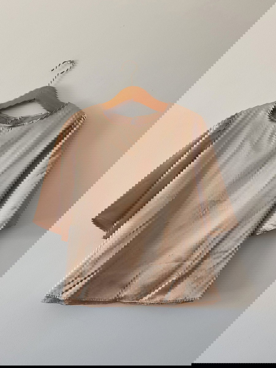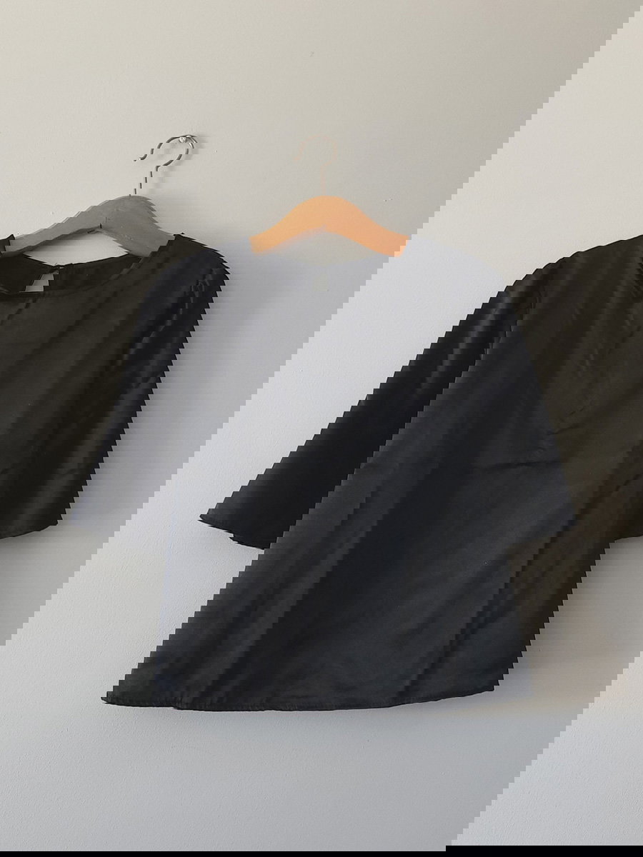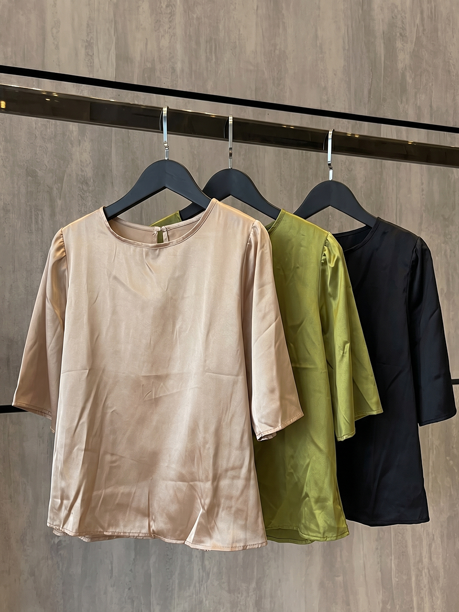 Blusa de tela satinada, con escote redondo y manga corta amplia. Presenta silueta recta, leve amplitud en el cuerpo y cierre con abertura y botón en la espalda. Terminación simple en ruedo y mangas.